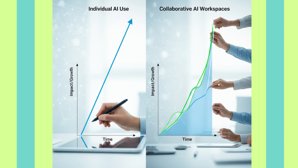 The choice between individual AI use and collaborative AI workspaces represents the difference between linear capability addition and exponential productivity multiplication.